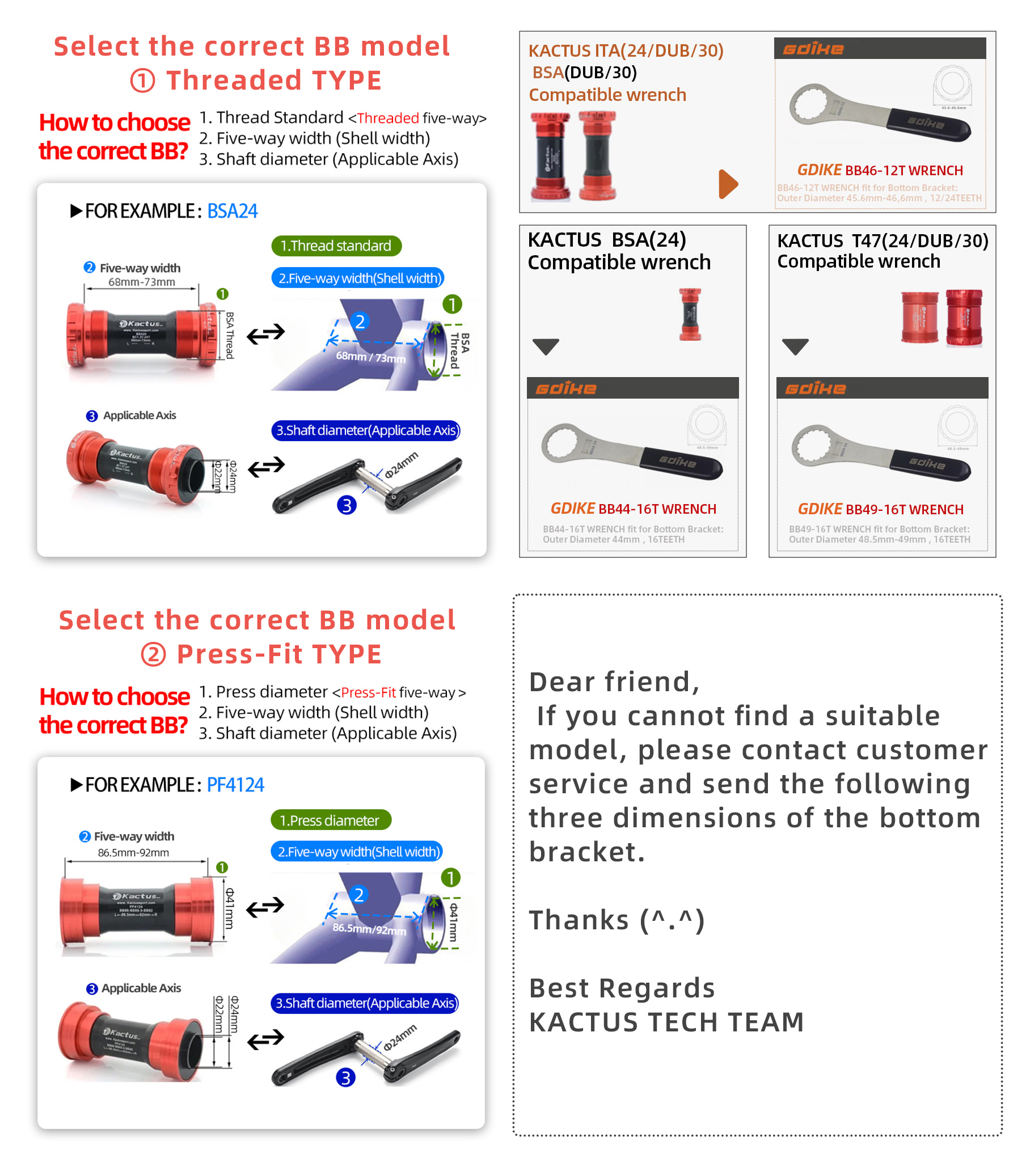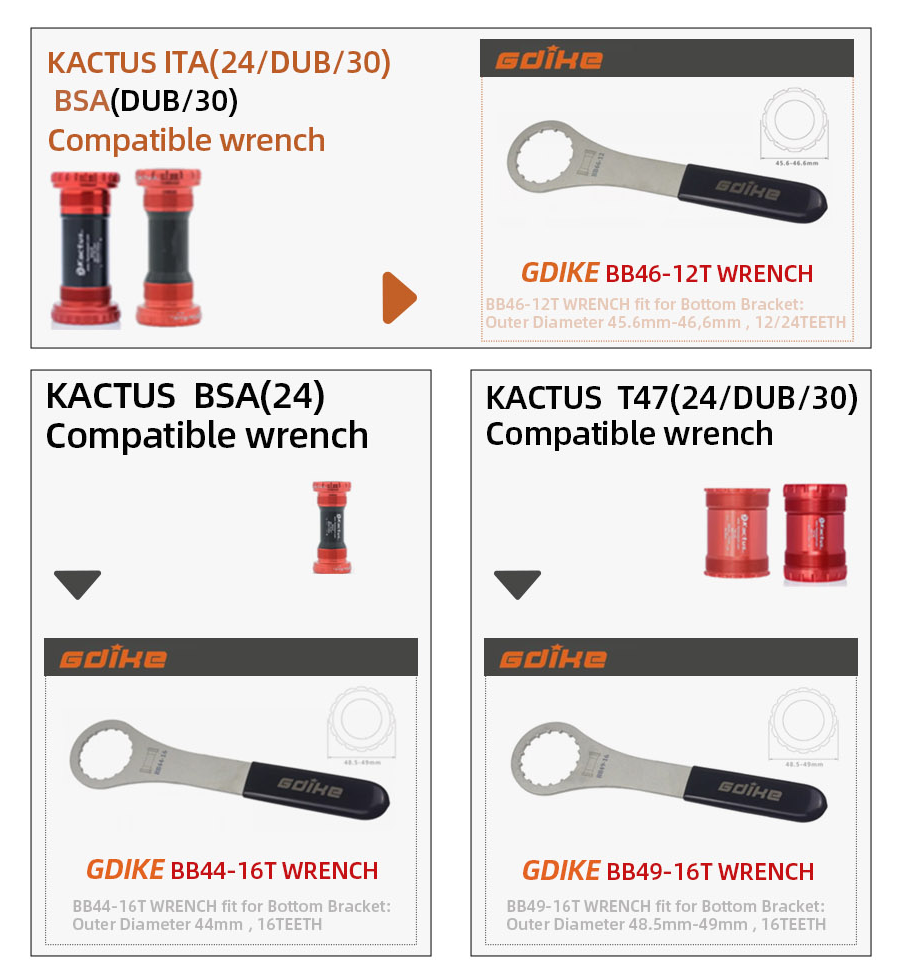 If you need the wrench fit for the BSA-DUB / BSA-30 bottom brackets of KACTUS ,you can check this one.BB46-12notch wrench