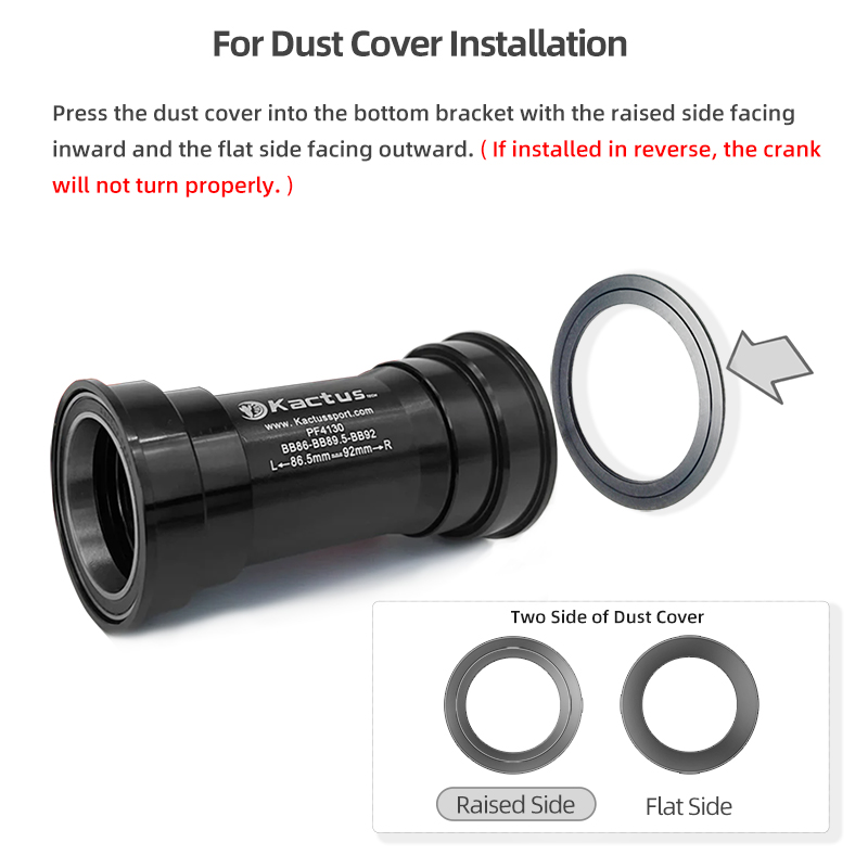 A: For Dust Cover Installation , Press the dust cover into the bottom bracke with the raised side facing inward and the flat side facing outward. ( if installed in reverse, the crank will not turn properly. )