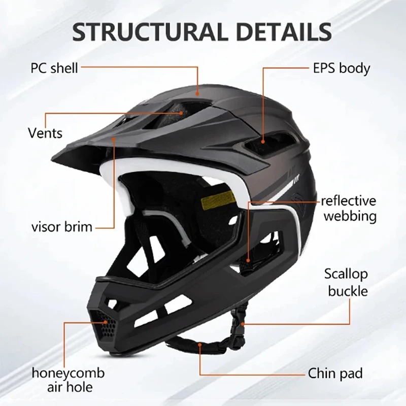 PC shell / EPS body / Vents / visor brim / reflective webbing / Scallop buckle / honeycomb air hole / Chin pad