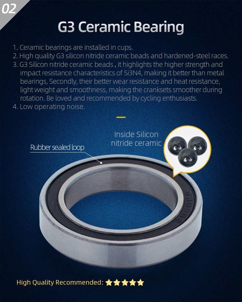 3.G3 Silicon nitride ceramic beads ,it highlights the higher strength and impact resistance characteristics of Si3N4, making it better than metal bearings, Secondly, their better wear resistance and heat resistance,light weight and smoothness, making the cranksets smoother during rotation. Be loved and recommended by cycling enthusiasts.