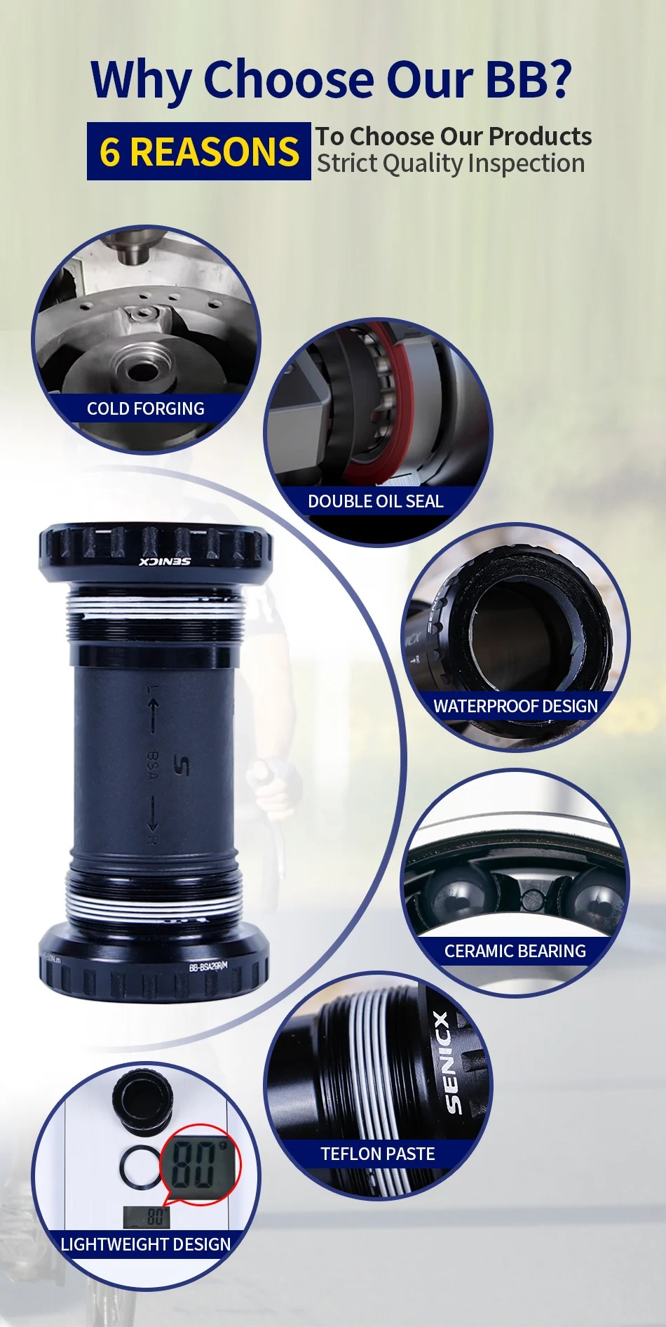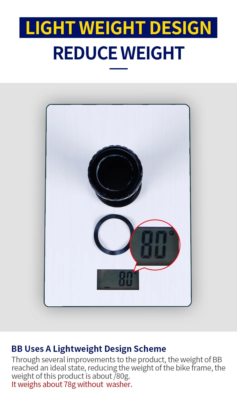 Through several improvements to the product, the weight of BB reached an ideal state, reducing the weight of the bike frame, the weight of this product is about 80g.